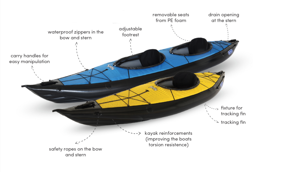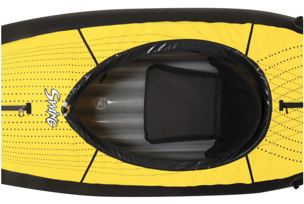 SWING 1 is a sit-in inflatable kayak great for relaxing trips on sheltered waters, harbours, lakes and rivers up to Gr. 2 white water. The kayak is supplied with two aluminium reinforcements for improved rigidity of the hull, maneuverability and stability. The reinforcements also shape the deck of the kayak. Thanks to its low weight the kayak is perfect for trips with frequent portages. The enclosed deck prevents water getting in. The kayak is available in a single and a double version.