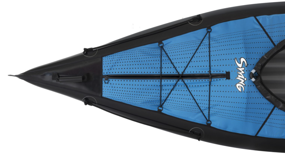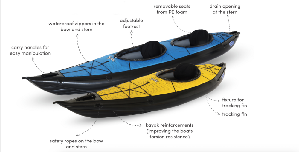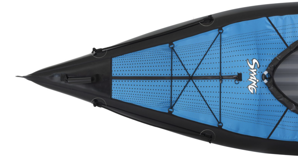 SWING 2 is a sit-in inflatable kayak great for relaxing trips on sheltered waters, harbours, lakes and rivers up to Gr. 2 white water. The kayak is supplied with three aluminium reinforcements for improved rigidity of the hull, maneuverability and stability. The reinforcements also shape the deck of the kayak. Thanks to its low weight the kayak is perfect for trips with frequent portages. The enclosed deck prevents water getting in. The kayak is available in a single and a double version.
