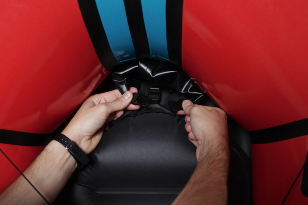 Without a floor mat the bailing hose must be closed. The bailing hose of the boat is turned inwards, rolled tightly at least three to five times and plugged together, ideally before inflation. However, it also works when the boat is assembled.