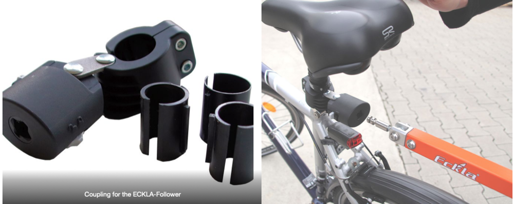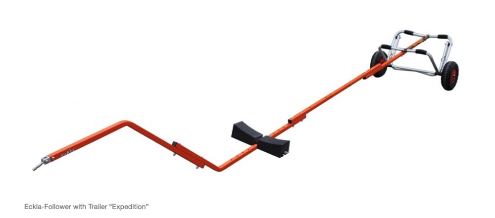 ECKLA-Follower is the new bicycle pull rod for transporting kayaks, canoes and surfboards. The bicycle pull rod ECKLA-Follower together with a Eckla-Explorer or ECKLA-Canyon becomes a practical trailer for the bicycle. The length and the height is adjustable.