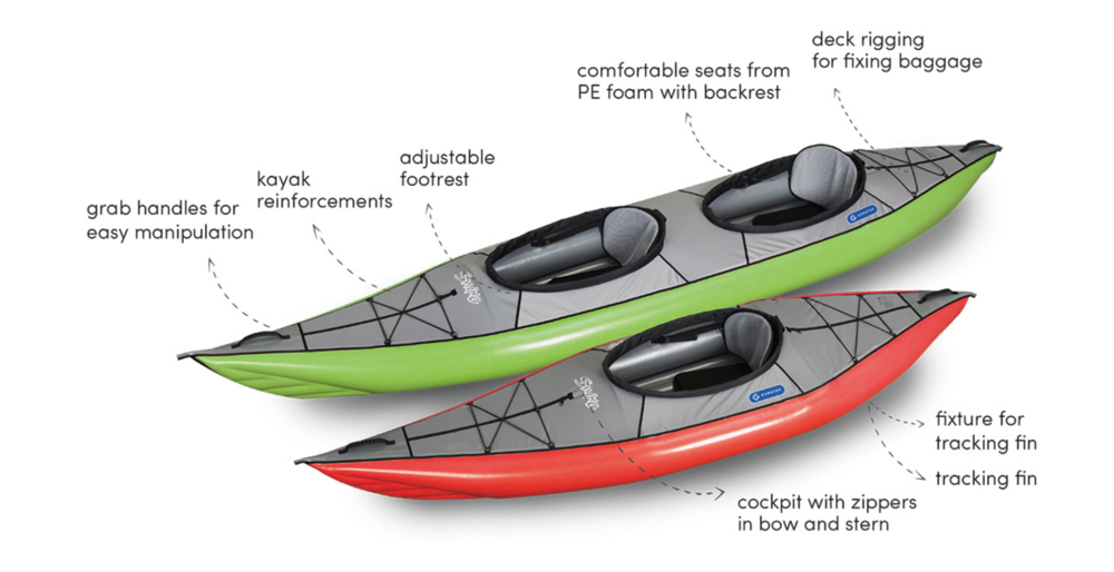 SWING 2 is a sit-in inflatable kayak great for relaxing trips on sheltered waters, harbours, lakes and rivers up to Gr. 2 white water. The kayak is supplied with three aluminium reinforcements for improved rigidity of the hull, maneuverability and stability. The reinforcements also shape the deck of the kayak. Thanks to its low weight the kayak is perfect for trips with frequent portages. The enclosed deck prevents water getting in. The kayak is available in a single and a double version.