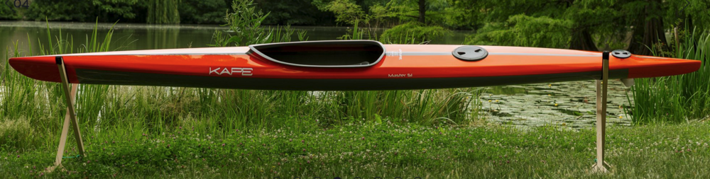 Compared to modern flat water fitness kayaks the Master 51 has a more traditional symmetrical shape, so widest around the seat section, giving the bow more buoyancy to surf, predictable handling at all speeds, but allowing a more blunt entry. The seating position is also located closer to the bow and the paddler sits more straight, so the catch area is closer and strokes are shorter and more relaxed. This is less efficient but more comfortable in the long run.