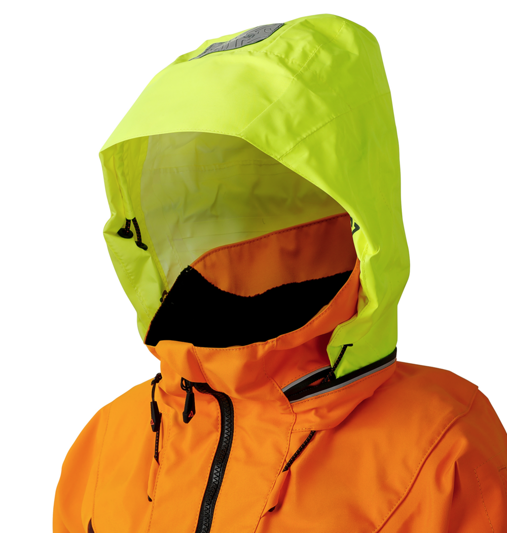 - Ergonomic, adjustable, hi-vis, packaway hood in fleece lined collar